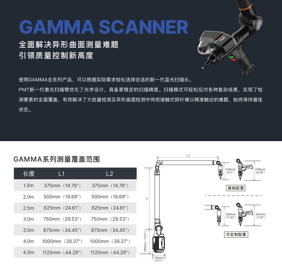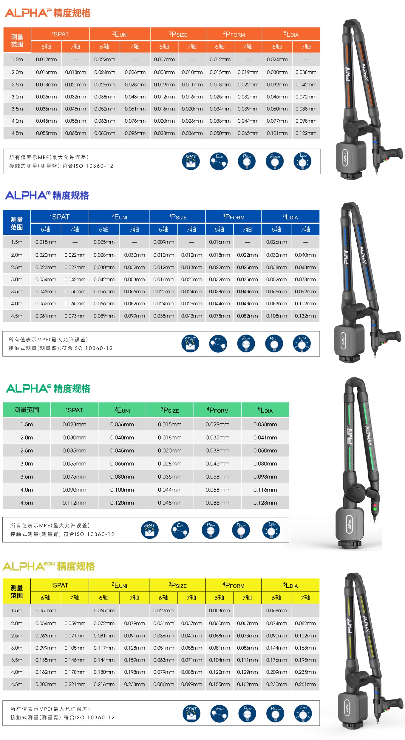 PMT ALPHA 6軸系列是一款革命性的測量臂,其量程覆蓋范圍為1.5m~4.5m,以0.5m為一個區間,共7種量程規格。