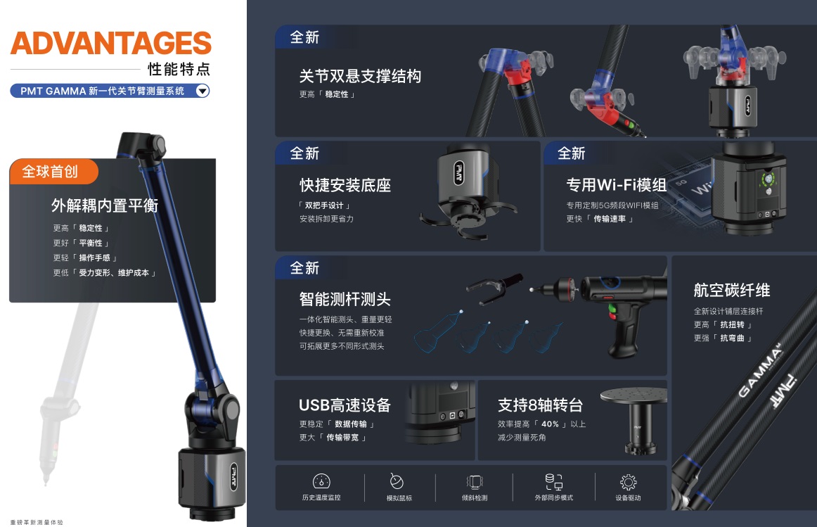 ALPHA 6軸關節臂采用最為適合現場測量的內置平衡機構及等臂長設計,結構簡潔均衡,操作靈活自如,細節大膽創新。