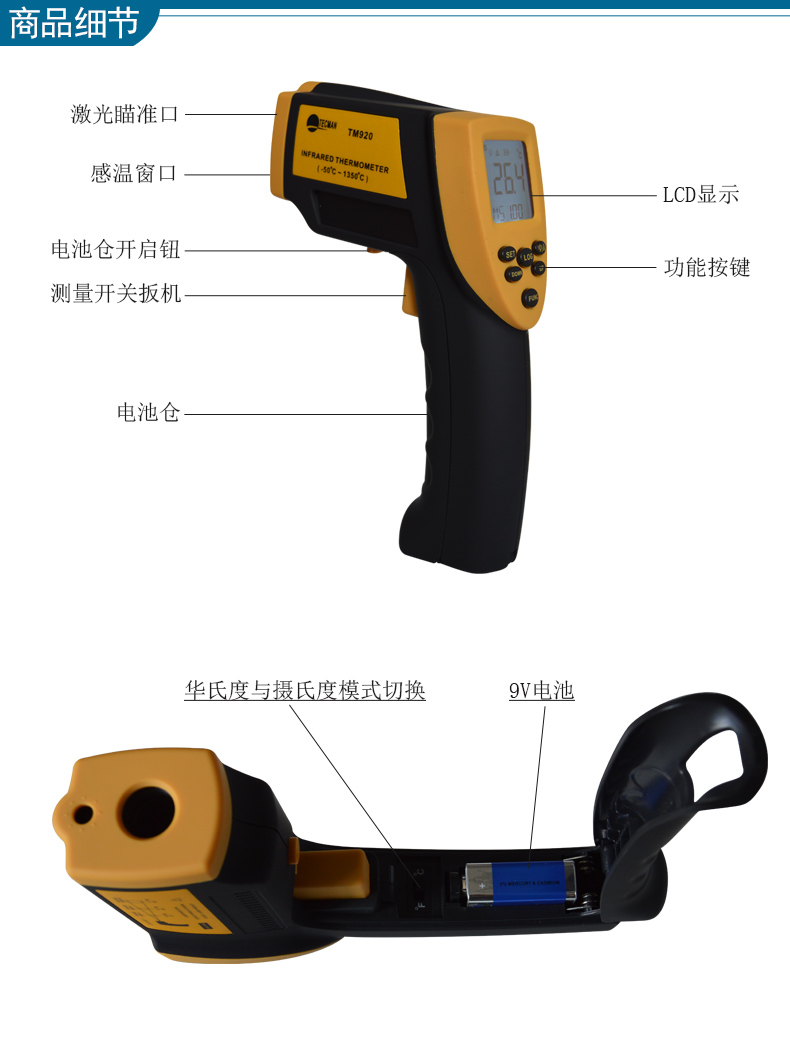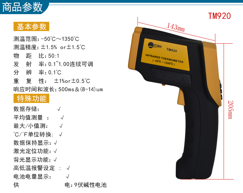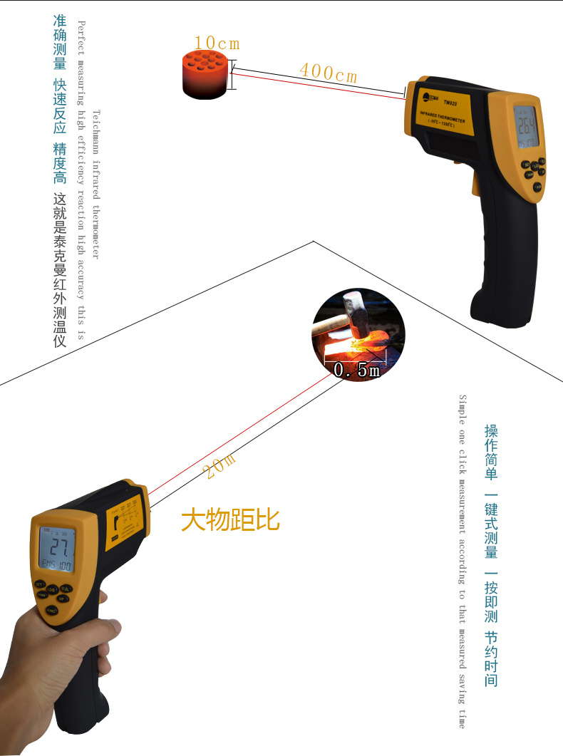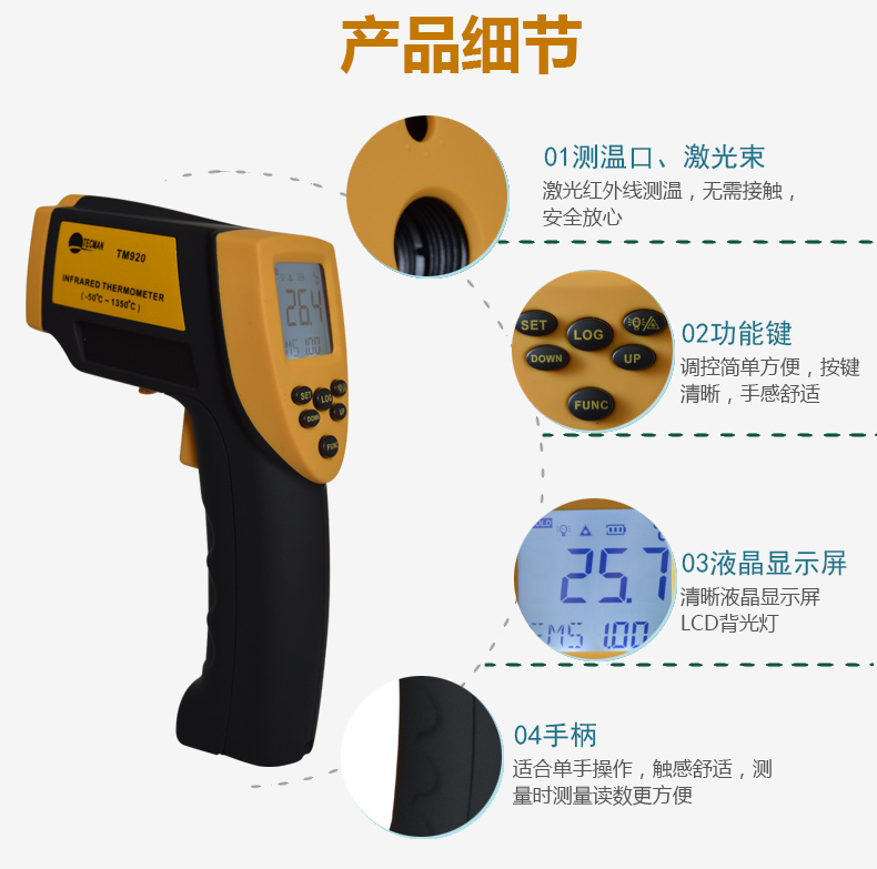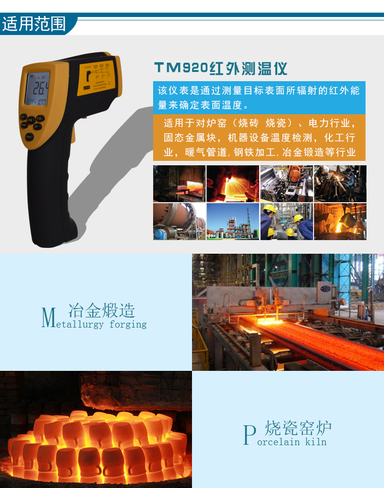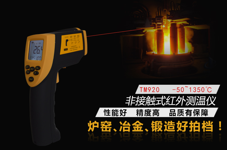 TM920高溫多功能紅外測溫儀,是高端專業(yè)式紅外測溫儀,測量溫度量程-50℃~1350℃,采用高靈敏度穩(wěn)定性更佳的鍺鏡片做紅外傳感器,TM950主要應用在冶金鍛造,金屬熱處理,窯爐溫度檢測等領(lǐng)域。