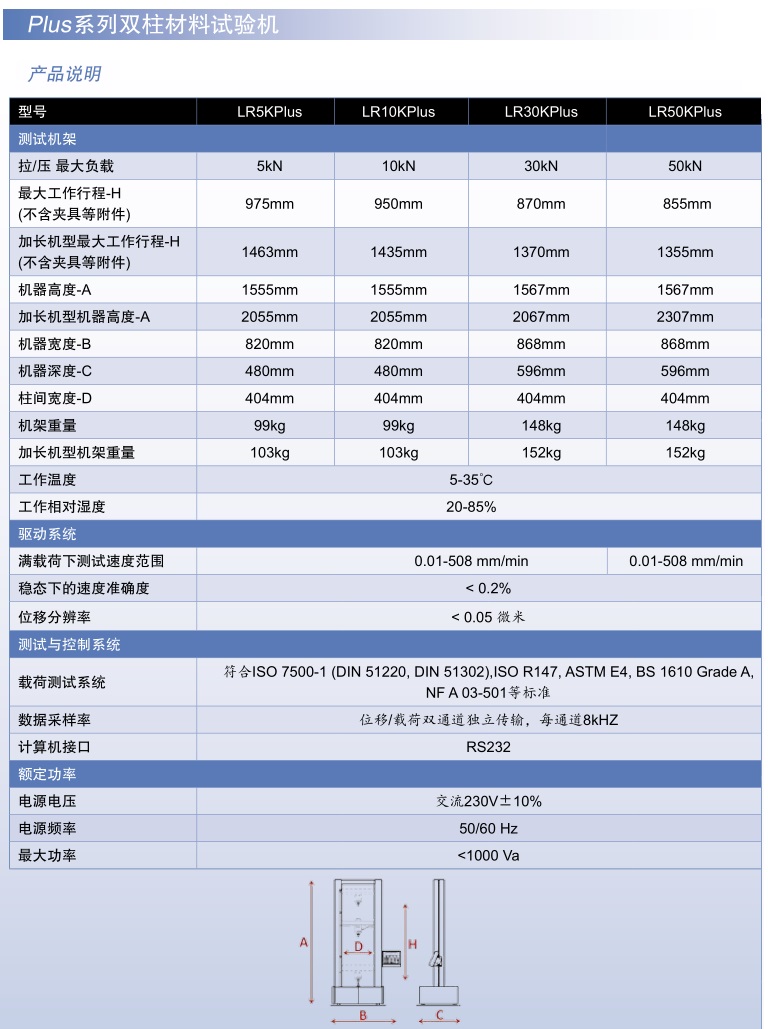 此外,LR Plus 系列有兩種落地式機型:LR100K Plus和 LR150K Plus 能力高達 150 kN(33722 lbf)。