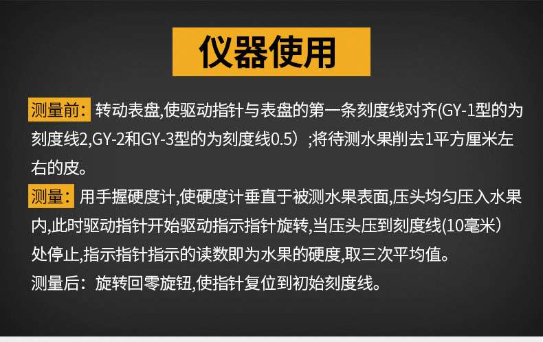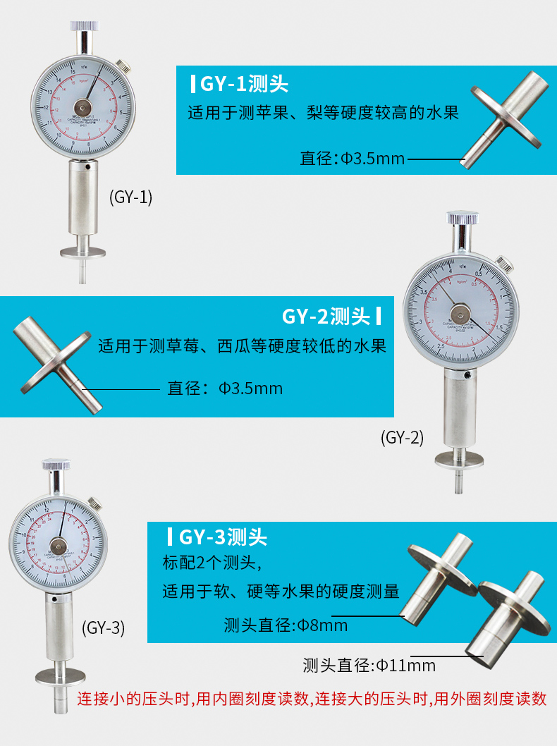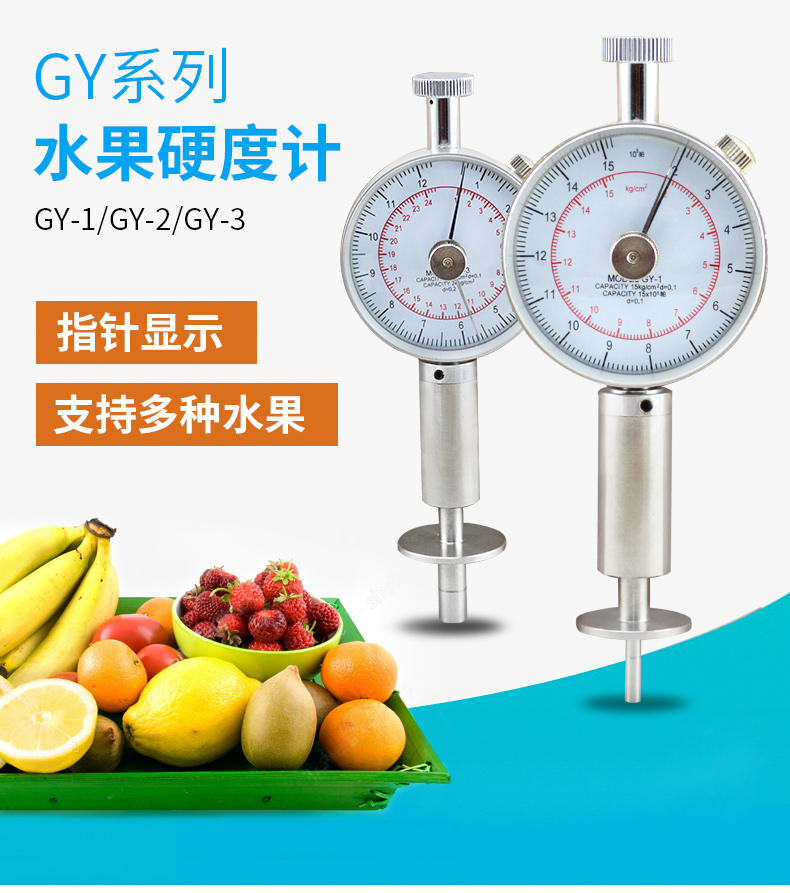 水果硬度計(又稱果實硬度計或果品硬度計),該產品共分GY-1,GY-2,GY-3三種型號,用來測量蘋果、梨、西瓜、香蕉等多種水果的硬度,用以判定水果的成熟程度,對培育良種,采摘時間,加工時間,收獲儲存,出口運輸等采摘的合理掌握。