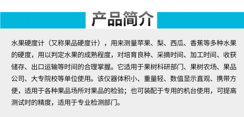 該水果硬度計體積小,重量輕,數值顯示直觀,攜帶方便,適用于各種果品場所對果品的檢驗。果實硬度計還可以裝配于專用的機臺使用,提高測試時硬度計的精度,適用于專業檢測部門。