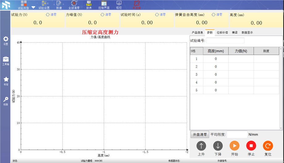 ? 四種試驗模式:定高度測力值、定變形測力值、定力值測高度、定力值測變形
